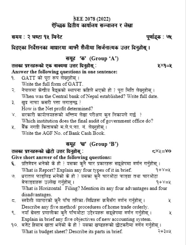 Model Questions of SEE 2078 (2022)-Office Practice and Account :